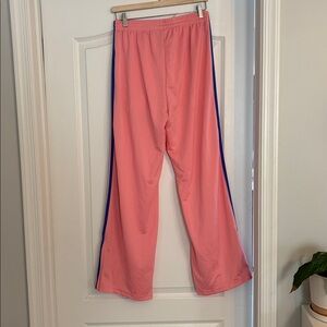 ADIDAS pink track pants with royal blue stripes. Pant bottoms have cool zipper feature. Drawstring waistband.