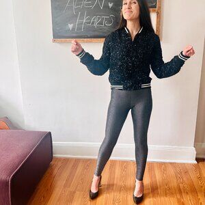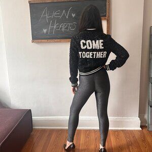 Fun, comfortable, XS black sequined jacket in perfect condition, never worn. Showroom sample. Zippered pockets, 'Come Together' written on the back, striped waist and cuffs.