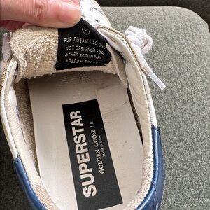 These are GG low top Superstars size 37 in white with black stars and navy tab at the back. Great condition. Making room for new stuff. Lmk if you have questions. I’m pricing these low, so be reasonable if you make an offer.