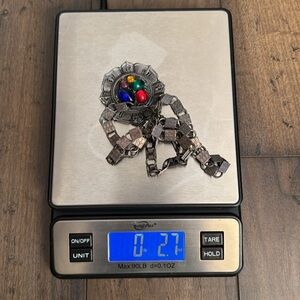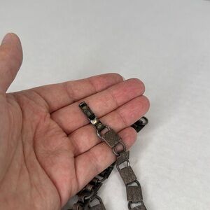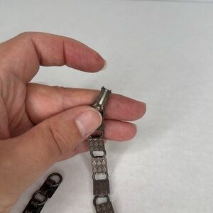 This necklace does not have a sterling silver marking to it but considering the weight of the silver and the way it is aging. We believe it to not be sterling silver as it sticks to magnets. The necklace is approximately 30 inches in length. The measurement of the pendant is featured in the pictures. This was purchased from an estate sale.