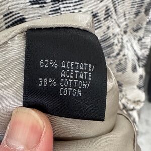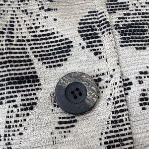 Stylish short-sleeve blazer with a black and cream pattern. Features a button-up front and notched lapel. Two front pockets. Fabric is unique weave to show the floral patterns, cotton acetate blend.