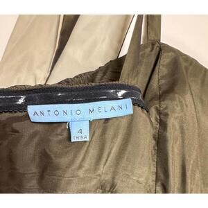 Keywords: Antonio Melani dress, size 4 dress, olive green dress, laser cut hem, sleeveless cocktail dress, semi-formal dress, classic sheath dress, women’s dress, work event dress, occasion dress.