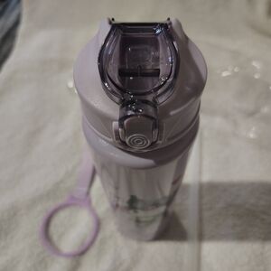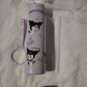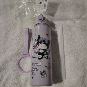 Cute Sanrio Kuromi water bottle. Features Kuromi design with hearts. Comes with a purple strap and straw.