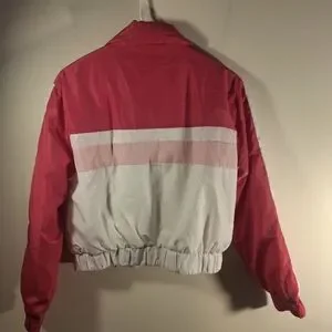 Stylish pink and white bomber jacket. Perfect for casual wear. Comfortable fit.