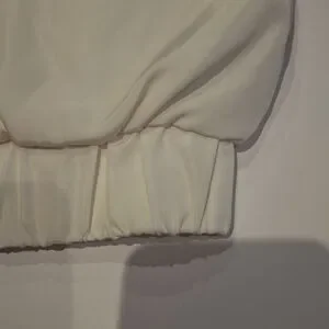 Lightweight women's pink and white long sleeve bomber jacket is new with tags.It is fleece lined, and has two front pockets.Sits at natural waist.There are no rips, tears, holes, or stains. It is made of 100% polyester. Machine wash cold, tumble dry.