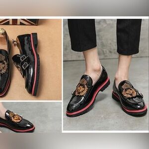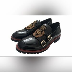 Elegant black loafers with gold embellishments, perfect for a sophisticated look.