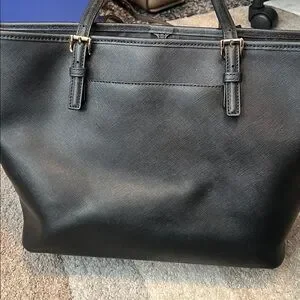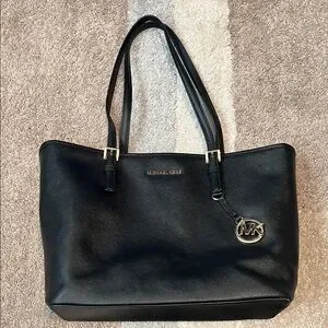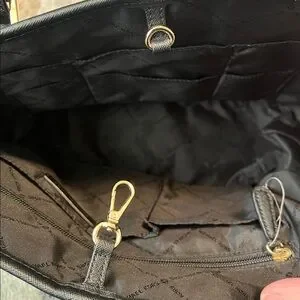 Black tote with adjustable carrying straps. Light gold hardware and MK emblem. Clasp closure at top; large open compartment including one zippered compartment and eight slip pockets.