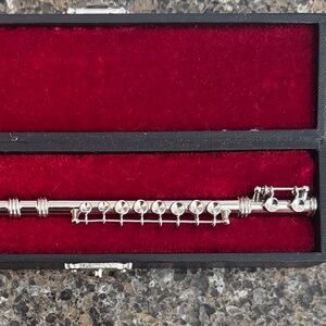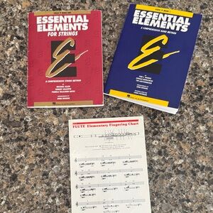 Set of miniature Essential Elements music books. a black metal stand. Includes books for flute and cello and a finger placement chart for flute, as well as the metal flute itself in a red leather wooden box