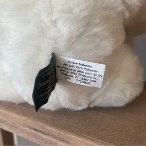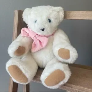 This fluffy white jointed plush bear features a delightful pink bow, perfect for snuggles and playtime. Baby shower decor.