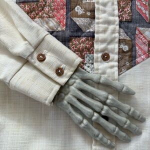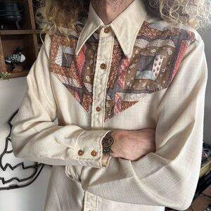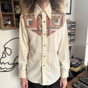 Vintage 60's / 70's cream colored long sleeve button down shirt with quilted yokes in a geometric floral pattern