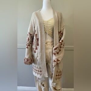 Trendy Geometric Fuzzy Cardigan. Soft Comfy Sweater. Open-Front.