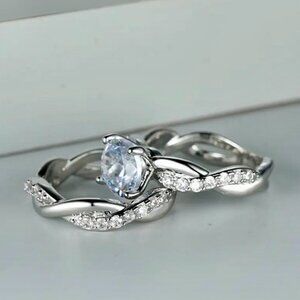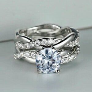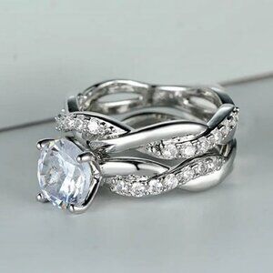 This exquisite 2-piece ring set is the epitome of classic elegance, featuring a stunning round brilliant-cut center stone set high atop a gracefully twisted shank, perfectly complemented by a matching, contouring band. Both rings are crafted with an 18K white gold-plated finish and lavishly accented with shimmering pave-set stones along the braided design, creating a dazzling display of continuous sparkle. This size 5 set is an ideal choice for a promise ring, engagement ring, or a beautiful anniversary gift.