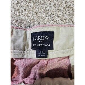 These J Crew men's shorts in size 36 feature a classic fit and a 9-inch inseam, made from cotton twill chino fabric in a red washed color. The flat front design with a button closure and logo accents make them suitable for both travel and casual occasions. With a low rise and easy care features, these shorts offer comfort and style, perfect for a colorful American city vibe. Complete with pockets for added functionality, these shorts are a stylish choice for men's wardrobe.