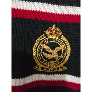 american living sweater, striped quarter zip, crest logo sweater, womens small knit, preppy stripe sweater, cotton knit pullover, navy red white sweater, casual quarter zip top