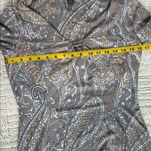 Excellent preowned condition. Lots of stretch. Elbow length sleeves. Grey and tan paisley pattern. Has shelf bra. SZ S. Please confirm measurements approximate laying flat in pictures as Poshmark does not accept returns for fit issues. Please scroll to see all eight photos provided.