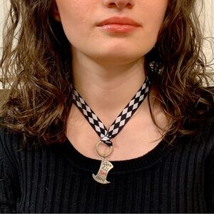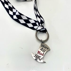NWT Artist crafted harlequin ribbon necklace with “We’re All Mad Here!” focal pendant. Lobster claw clasp with a 2 inch extension chain for perfect sizing. Layers nicely with other accessories