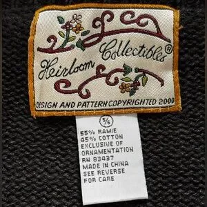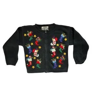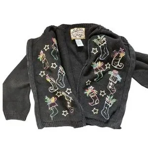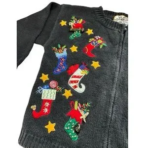 One of a kind nostalgic Christmas sweater for kids. Black cotton ramie blend knit with colorful stocking decorations and functional bells on the front. Zippered front (zipper works well). Good used condition. Some bells and sequins are missing. Children’s size 5/6.