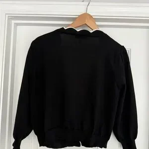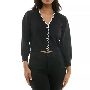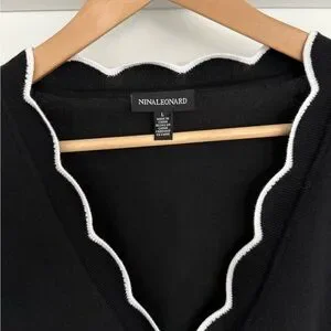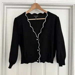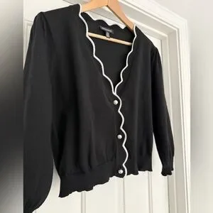 Stylish black cardigan with elegant white scalloped trim. Never worn, missing tags. Excellent condition. Smoke free and pet free home.