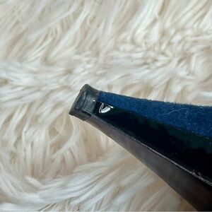 Miu Miu Navy Blue Suede Black Patent Leather Slingback Heels Sandals Size 9.5. Normal wear on the bottoms. Small scuff on the inside of one heel, not very noticeable . See last pic. Tops of shoes excellent!