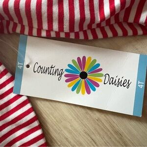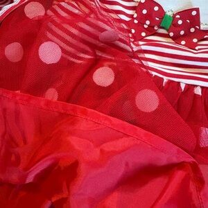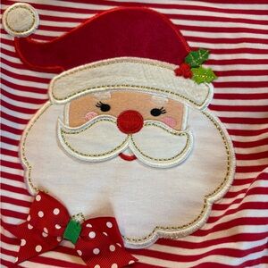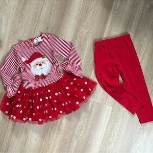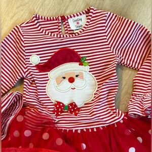 Festive striped dress has flared sleeves and is adorned with a jolly Santa appliqué, and polkadot tutu. Red leggings complete the ensemble.