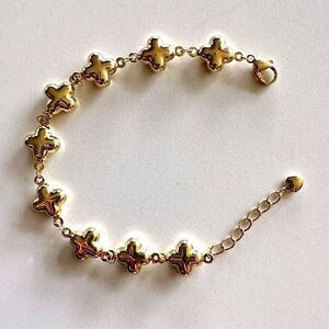 Add a touch of luxe to your wrist stack with this yellow gold plated bracelet. Featuring polished clover-shaped links, each with a soft, rounded silhouette that catches the light beautifully. The adjustable lobster clasp and extension chain ensure a perfect fit from 7” to 8”.