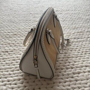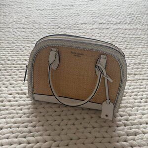 Kate Spade straw satchel with zip top and handles. Like new, worn only twice. SIZE. 9.4"h x 11.7"w x 5.9"d; drop: 18.5"; handle drop: 5.5". MATERIAL. straw with saffiano leather trim; two way spade jacqard lining.
