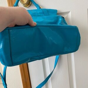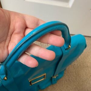 Vibrant blue satchel with gold-tone hardware. Features a top handle and adjustable strap. Stylish and functional design.