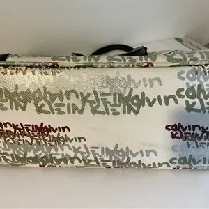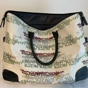 Chic tote with Calvin Klein logo pattern. Features black handles and accents. Ideal for daily use.