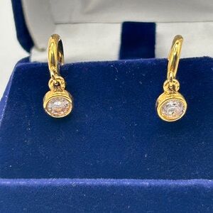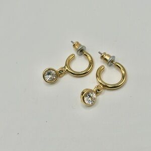 Elegant gold hoop earrings featuring bezel set round crystals. Dainty and classy! Perfect for any occasion.
