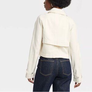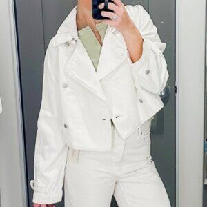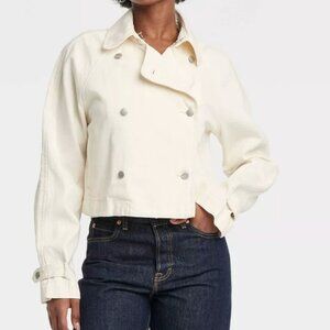 Stylish cream trench coat. Double-breasted design. Buttoned cuffs. Perfect for layering.