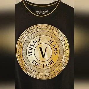 Stylish black top with bold gold emblem. Short sleeves. Perfect for casual wear.