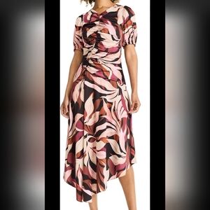Chic dress with abstract pattern. Features ruched bodice and puff sleeves. Asymmetrical hem adds flair.