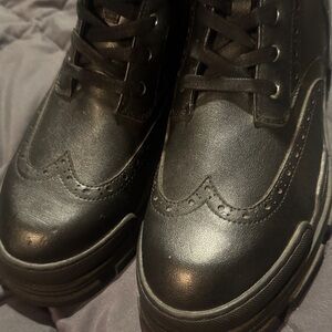 Sleek DKNY combat boots with lace-up design. Versatile and modern. These boots have never been worn. They have a small imperfection on the end of the toe which somehow happened. I’m not sure how. But I posted lots of pictures. These are awesome boots.