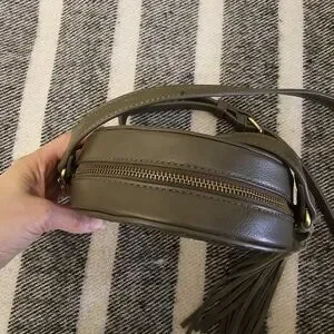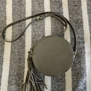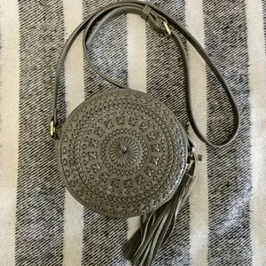 Boho hippie Anthropologie olive green circular crossbody bag with intricate detailing and tassel accent. Adjustable strap. Like new condition