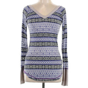 Stylish long-sleeve blouse with intricate patterns. Features a V-neckline and fitted design. Perfect for casual wear.