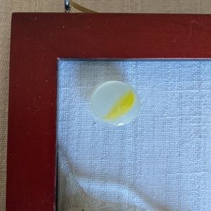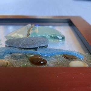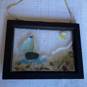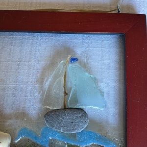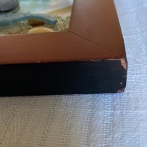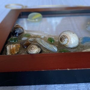 This unique wall art was a gift so I don’t have a lot of details on it. I believe pieces of sea glass, shells, & rocks are adhered to glass within the frame. There have always been minor imperfections in the frame, I assume to give the piece a weathered “beachy” look. It hangs on a gold ribbon (which could be changed to suit your taste). Great piece if you like the ocean or lakes - or to give as a gift. Additional approximate measurements: frame is 5/8” deep & because of the shell the piece is 1” deep. Last picture is of the reverse side.