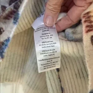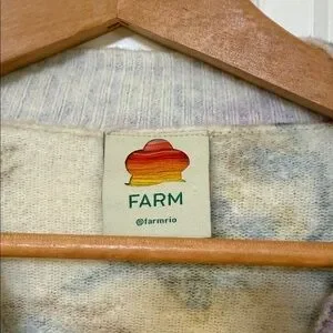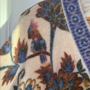 Chic floral Alpaca cardigan by FARM Rio. Features intricate blue and brown floral patterns on a cream base. Perfect for layering. Size Large. See photos for measurements.