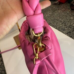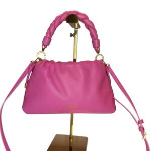 That bag is the Kate Spade Meringue small crossbody bag. It is crafted in smooth nappa leather and features a braided top handle and a drawstring closure. &
