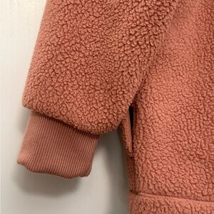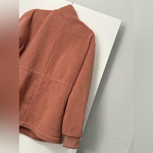 Stay warm and stylish with this cozy fleece jacket. Perfect for chilly days, this rust-colored jacket offers comfort and a trendy look. Has two side pockets. Cinched waist detail.