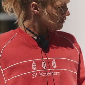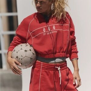 Cozy red sweatshirt and shorts set from FP Movement. Features white piping details.