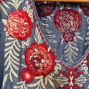 This Johnny was size XL elegant V-neck top features intricate floral embroidery in vibrant red on a classic blue background. Perfect for adding a touch of sophistication to any outfit.