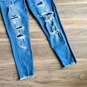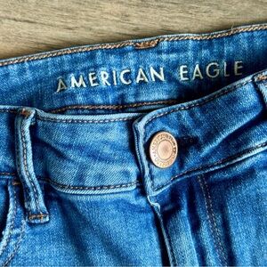 Keywords/Tags: American Eagle jeans, AE skinny jeans, distressed denim, ripped skinny jeans, high rise jeans, medium wash denim, casual everyday style, raw hem jeans, trendy denim, women’s skinny jeans, modern streetwear denim, relaxed weekend outfit, stretchy jeans, classic blue jeans, frayed hem denim, effortless casual wardrobe, everyday essentials, teen fashion style, soft stretch denim, ripped knee jeans