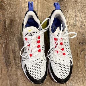 Stylish Nike Air Max 270 with a sleek design. Features white and black with vibrant lime accents. Comfortable and modern look. Size 10, but a 9.5 could fit.
