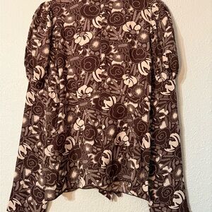 Chic brown blouse with floral design. Features a stylish tie-neck detail. Ideal for versatile wear.