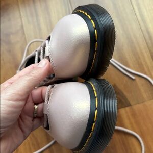 Get to the point. The Elphie ballet flat is our twist on a classic. Less dainty. More Docs. A pointed ballet flat shoe made from powder pink leather with an iridescent finish. Fitted with wraparound laces, easily swapped out for a customised look. The tapered sole is marked with DM's signature grooving pattern and secured with yellow welt stitching.