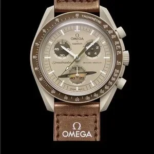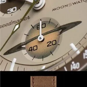 On this non-limited model, sandy, cool beige tones contrast nicely with a brown dial and VELCRO® strap. The chronograph seconds hand and the subdial hands at 10 and 2 o'clock are in green. The seconds subdial at 6 o'clock depicts Saturn's rings. A white tachymeter scale adorns a brown-colored bezel. The hour and minute hands as well as the hour markers and tachymeter scale are in white. All dials in the collection carry the OMEGA X Swatch branding, the iconic Speedmaster and the MoonSwatch logo. The biosourced glass construction, the etched "S" integrated in the center of the glass, the fine and sophisticated circular pattern on the dial outer ring and the recessed subdials, the angular and smooth lugs construction, the iconic “dot over 90” detail on the tachymeter scale, and of course the unique Bioceramic feel are common to all models. The hour, minute, and chronograph seconds hands as well as the hour markers sport Super-LumiNova® for a perfect glow in the dark.