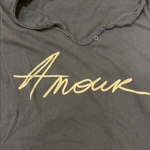 Dark blue tee with 'Amour' script. Casual and chic style.