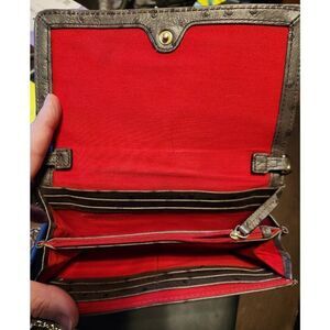 Dooney & Bourke grey faux ostrich fold over wallet, clutch, or crossbody. Classic red Interior