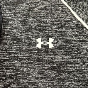 Charcoal hoodie with Under Armour logo. Features drawstring hood and long sleeves.