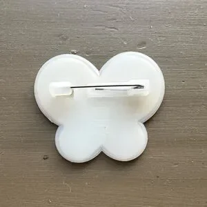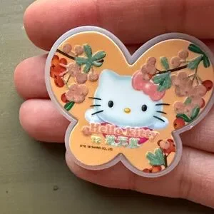 Super cute plastic brooch pin with hello kitty and flower patterns on it.